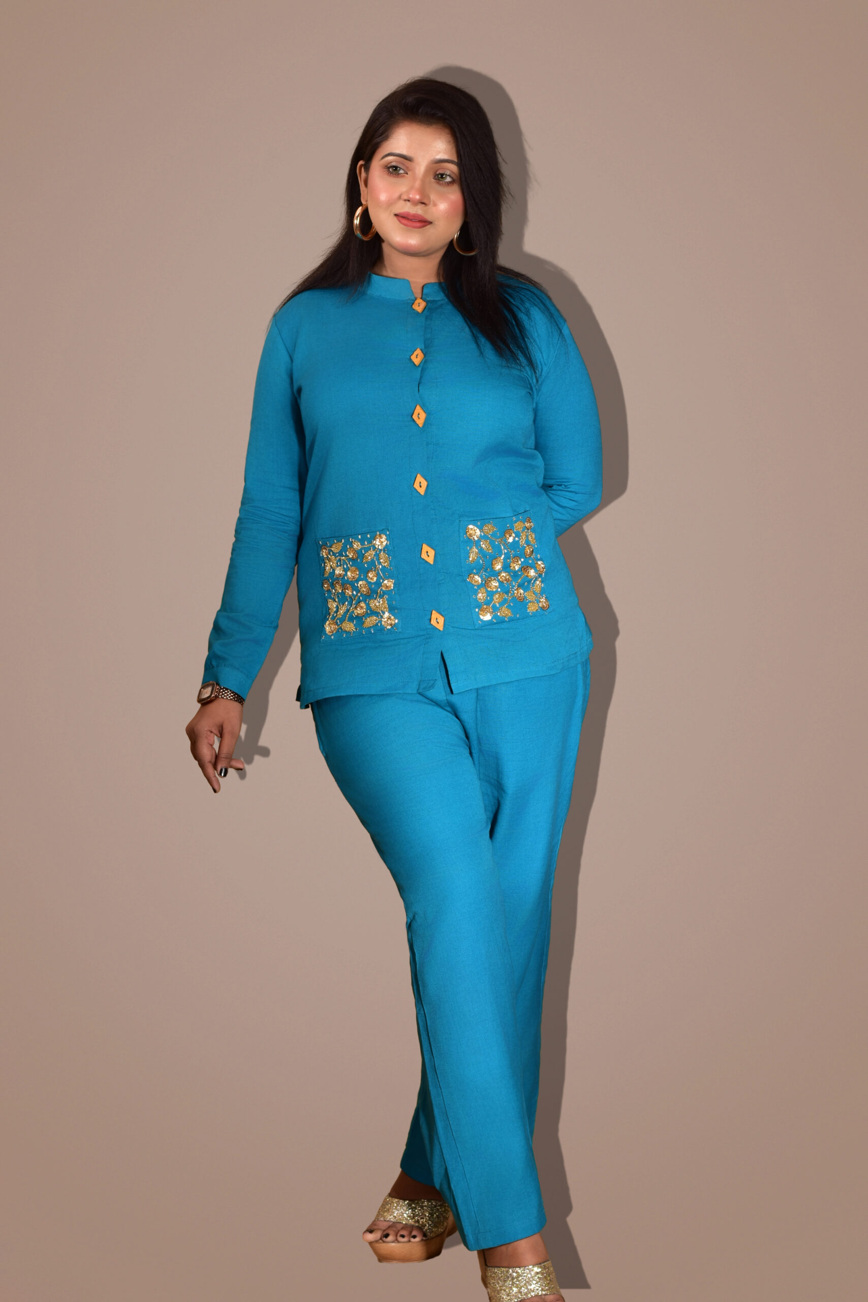 1.Elegant Design: An azure blue co-ord set featuring handcrafted zardozi embroidery on the pockets and rustic wooden buttons for a blend of traditional charm and modern style.
