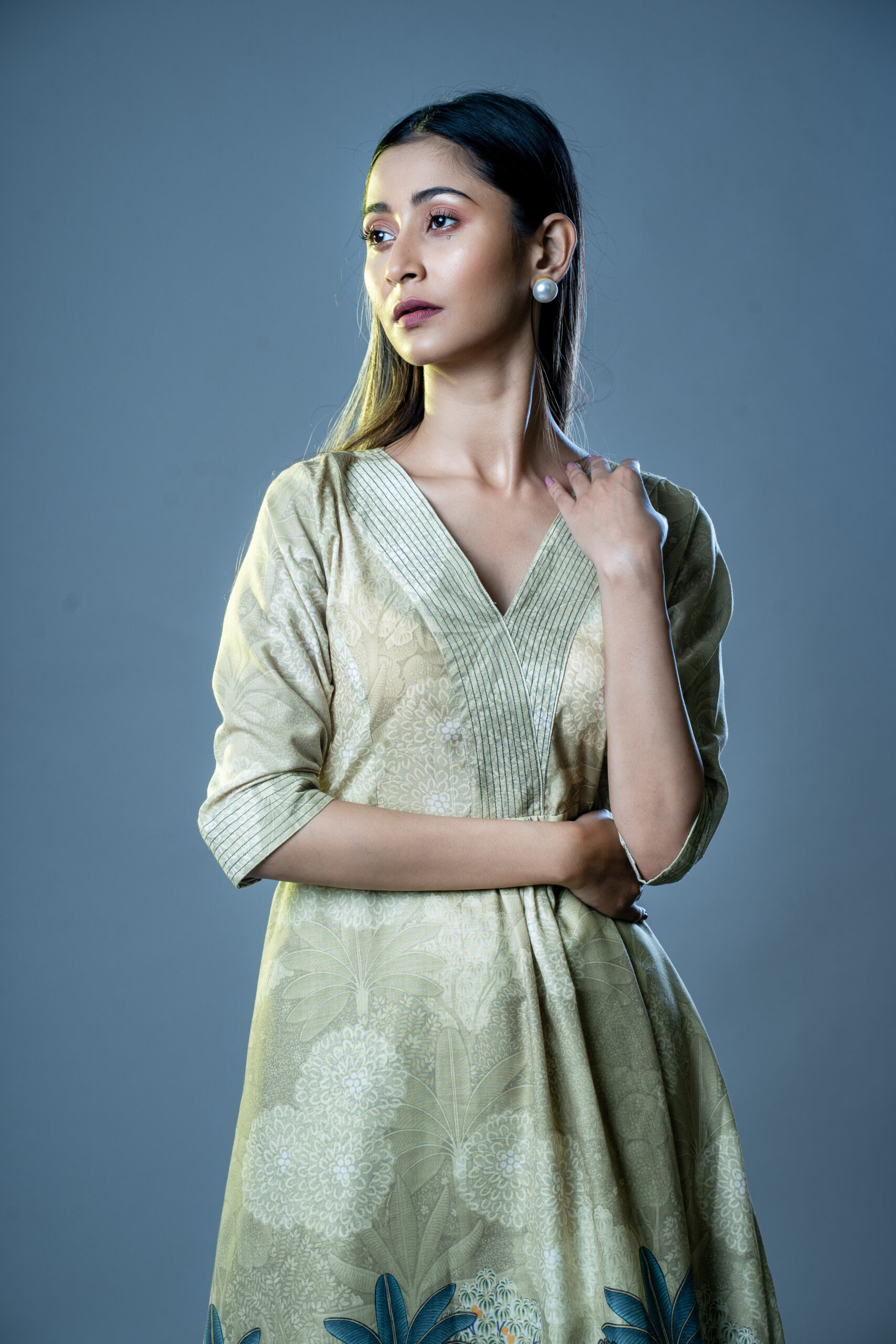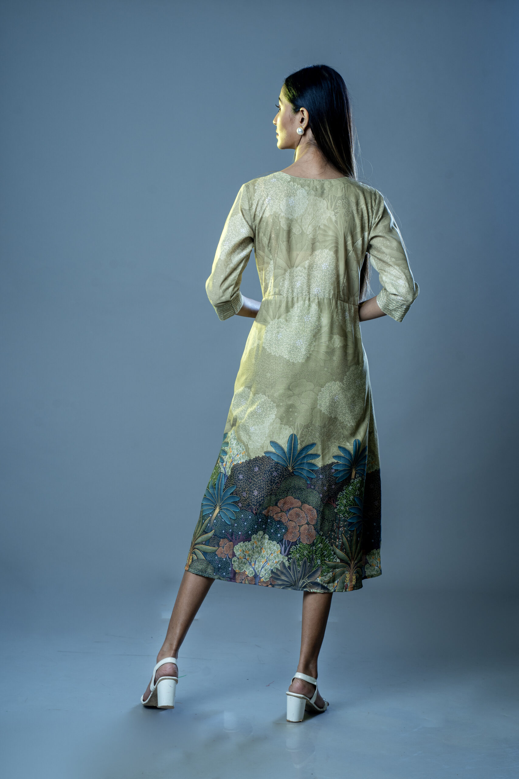 Crafted from lightweight muslin cotton, the dress is designed with a flattering V-neckline highlighted by fine pintuck detailing at the yoke. The three-quarter sleeves are finished with textured cuffs, adding refined detailing. Its flowy A-line fit ensures comfort while enhancing movement and style.