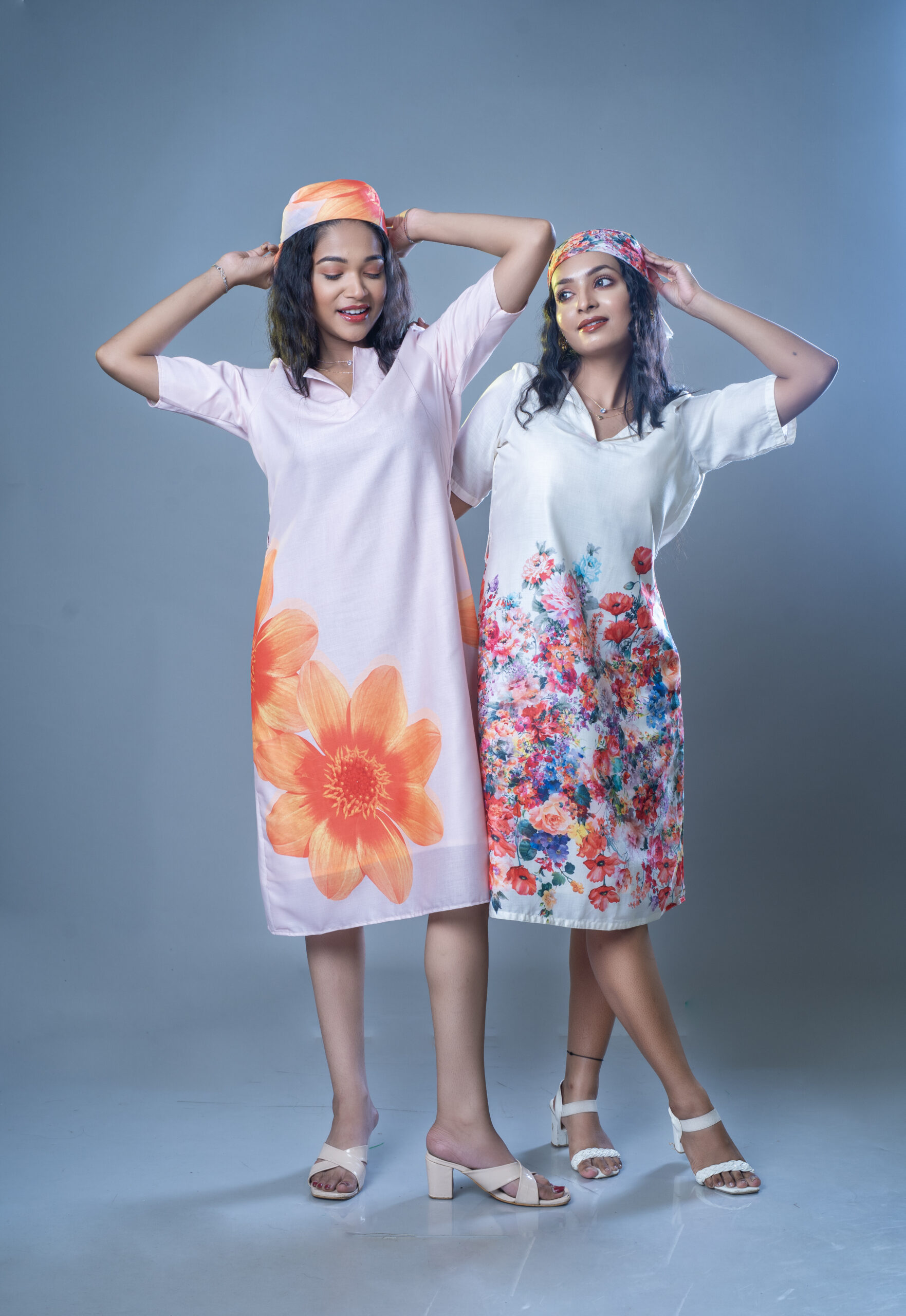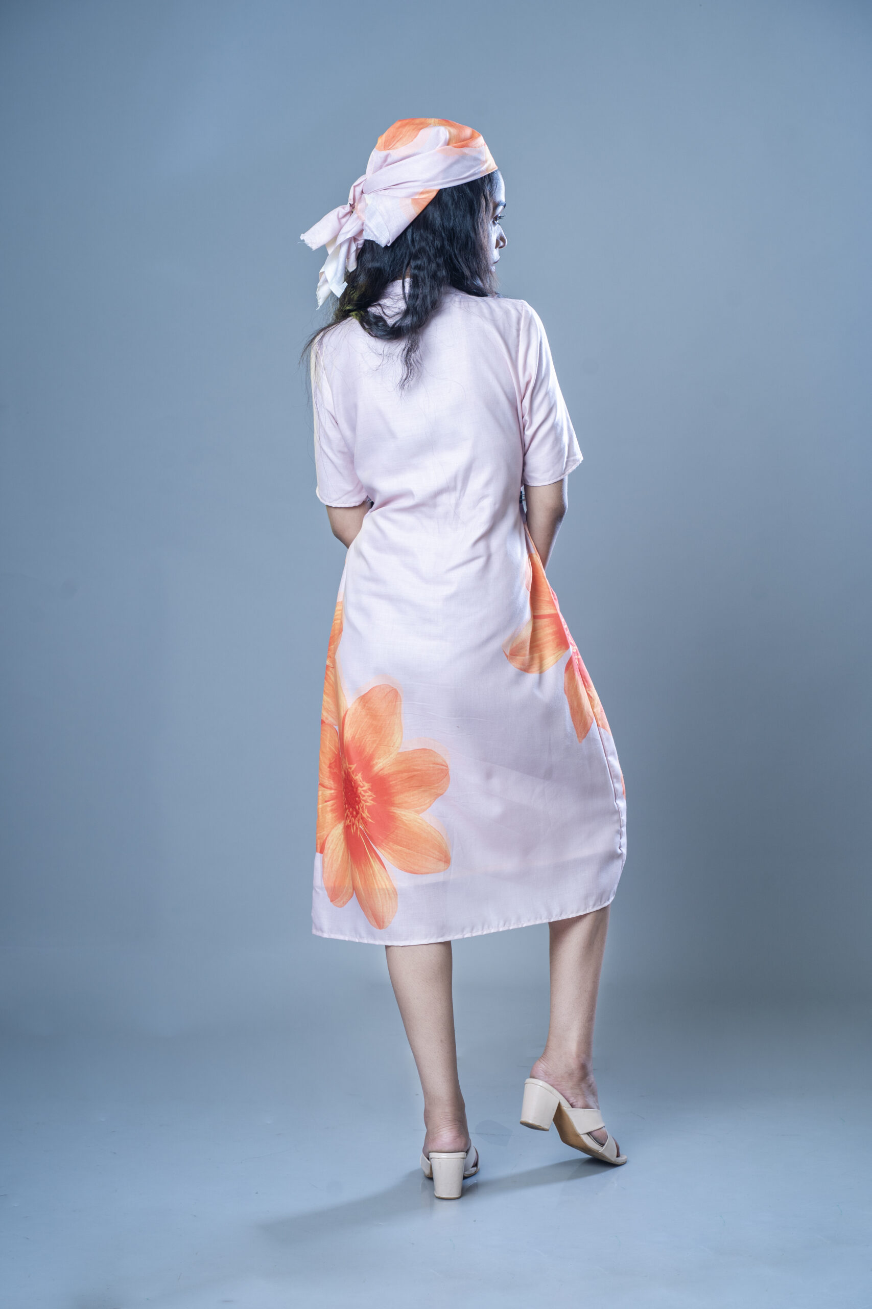 1. Fresh & Vibrant Design: The Citrus Bloom Midi-Dress is crafted from breathable muslin cotton in a delicate blush-pink hue, elevated with bold oversized citrus-orange floral prints near the hemline for a fresh and playful vibe.