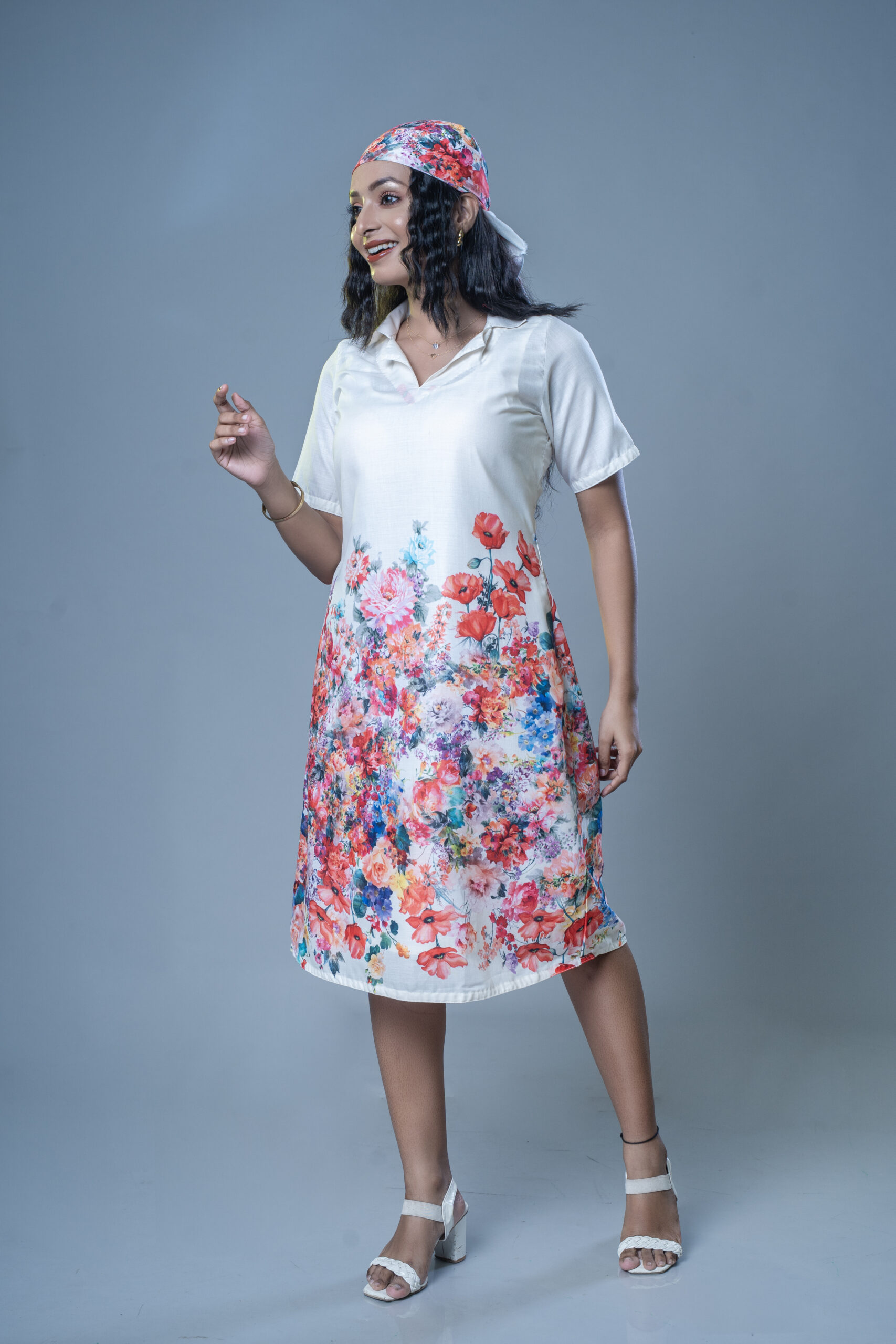 1. Elegant Contemporary Design: The Ohh So Floral Midi-Dress is made from lightweight, breathable muslin cotton that keeps you cool and comfortable all day. It features a crisp white base adorned with a vibrant multicolor floral print starting mid-waist and flowing gracefully to the hemline, creating a lively yet sophisticated aesthetic.