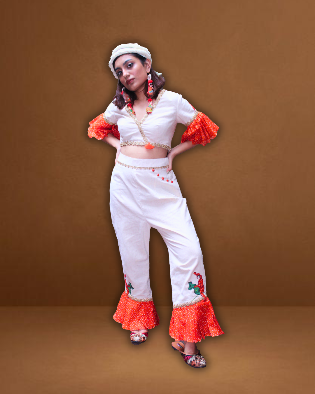 Celebrate tradition with a twist! This V-neck crop top and wide-leg pant set is inspired by Kathputli Kala, featuring bright orange ruffles and handcrafted details. A perfect blend of folk artistry and modern design, this statement outfit from Label Shaj adds vibrant charm to every occasion.